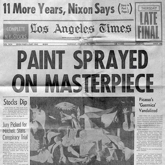 One member of the group was Tony Shafrazi, who returned in 1974 to spray paint the Guernica with the words "KILL LIES ALL" in blood red paint, protesting about Richard Nixon's pardon of William Calley for the latter's actions during the My Lai massacre.
